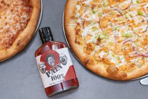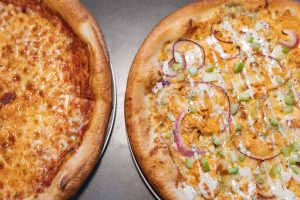 Olive oil, mozzarella, all-natural buffalo chicken tossed in Pain 100% hot sauce (as featured on Hot Ones), gorgonzola, red onion, with Dewey’s Peppercorn Ranch and celery added after the bake